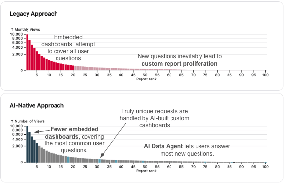 The tail is better handled with AI. A data agent can answer most tail questions, reducing or eliminating the need to endlessly build dashboards. When customers can ask questions naturally, they can find the value in the platform and relate it to their business outcomes.